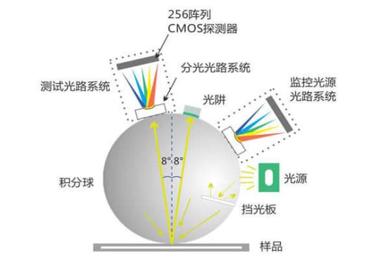 色差儀的積分球發(fā)出光的作用是將來自被測物體表面的所有可見光都集中在一個小圓球上,然后通過狹縫將這些光傳到積分球中心。此時,透過狹縫看到的是積分球內(nèi)部的光斑。由于積分球內(nèi)部具有很多顆粒,因此可以將各個波長的光分開。