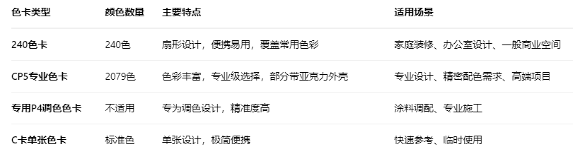 240色卡作為最普及的版本,采用扇形設計,包含從中性基礎色到流行色的全面選擇,足以滿足大多數(shù)家庭裝修需求。